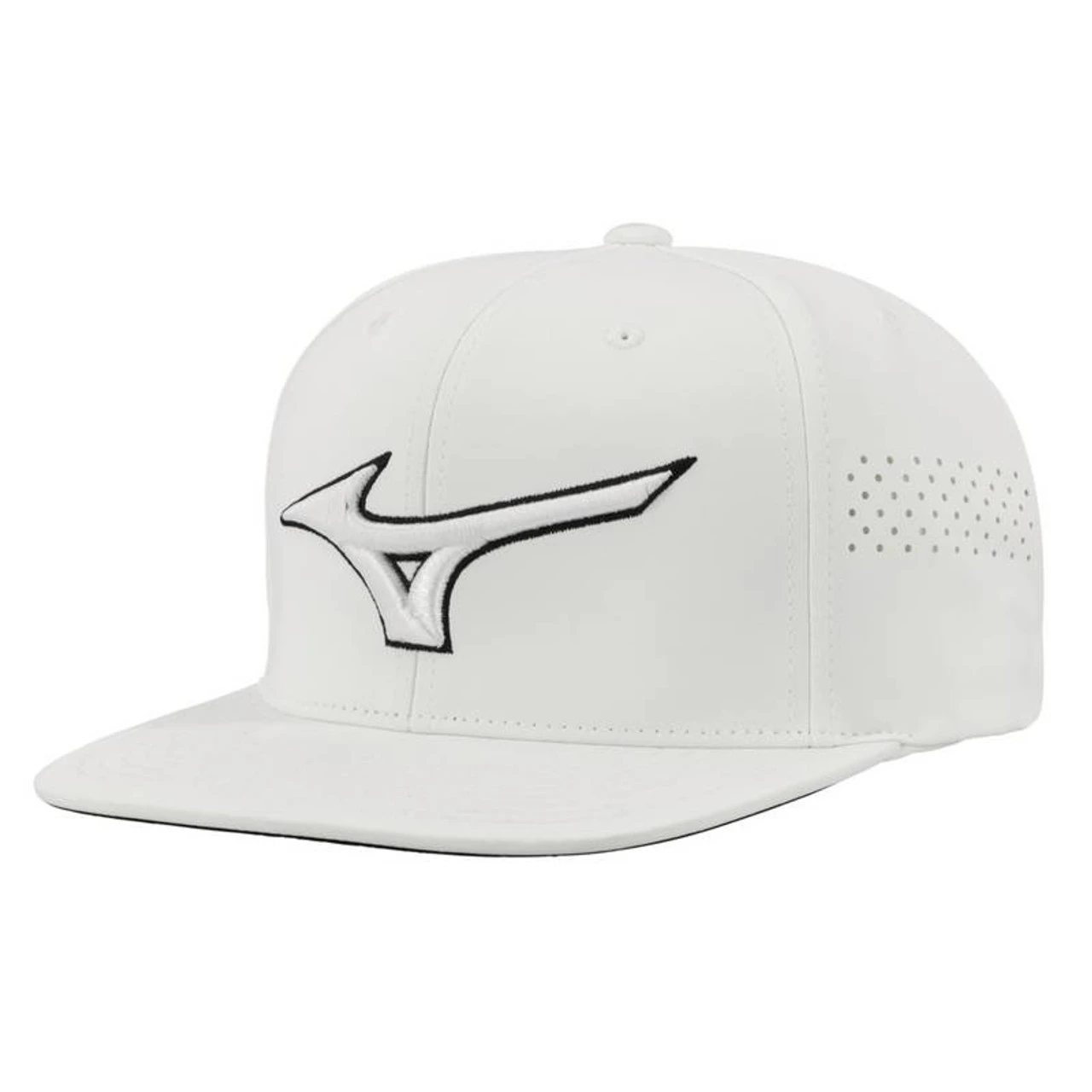 The Mizuno Tour Flat Snapback Cap is a flatbill that shares the same fabric as the Tour Delta style with an adjustable snapback closure. Laser cut vent holes on the side panels add breathability and give the hat a modern look. Features a 3D embroidered logo with accent color outline. The new 3-layer multi-function headband features patent-pending stain block technology to prevent sweat stains on the cap’s crown.