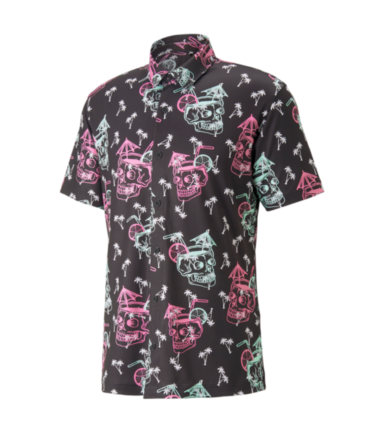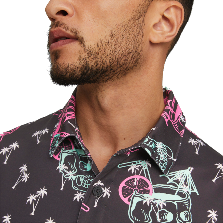 Get Tropi-cool with a skull cocktail and palm trees in this too-cool-to-miss button up shirt. Featuring MATTR fabric technology, this top is designed to fight back against all environmental hooks and slices the day might bring you. Extreme conditions are no match against this moisture-wicking fabric.